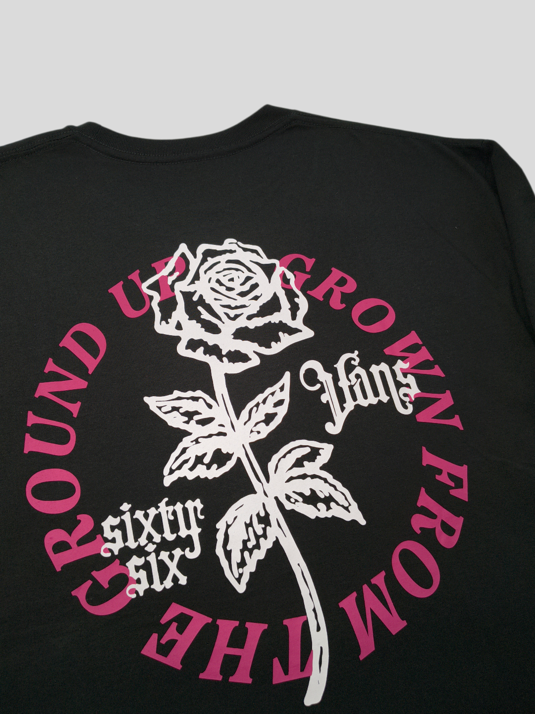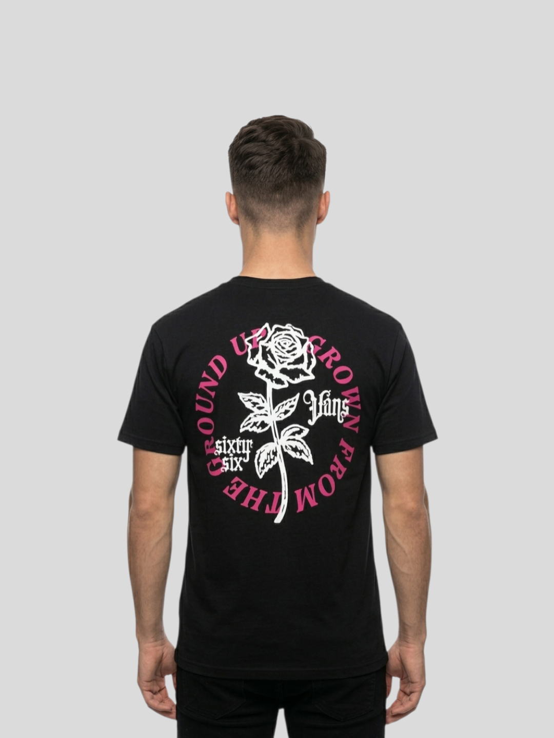 ”Baseado no padrão oficial da linha Ground Up: estampa frontal no peito com arte da rosa + versão ampliada nas costas, mantendo conforto e estilo pro dia a dia.”