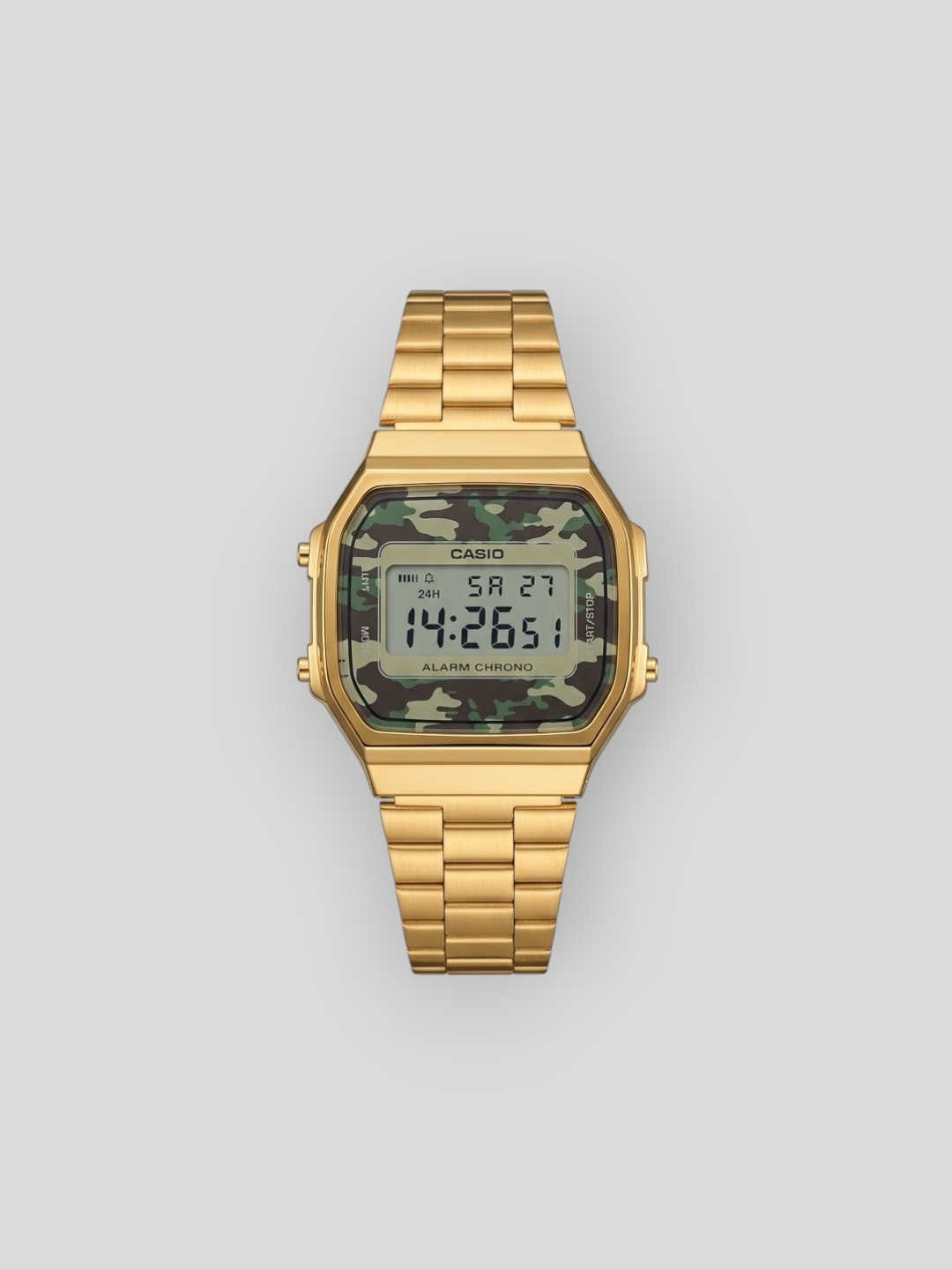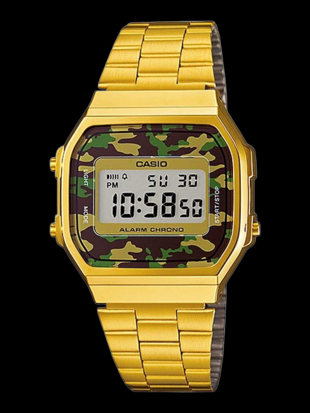 Clássico retrô com personalidade única. O Casio A168WEGC-3 combina o design icônico da linha Vintage com um visual diferenciado: caixa dourada com pulseira em aço inoxidável e visor com padrão camuflado. O resultado é um relógio que mistura estilo urbano, nostalgia dos anos 80 e funcionalidade digital confiável — perfeito para quem quer um acessório marcante no pulso.