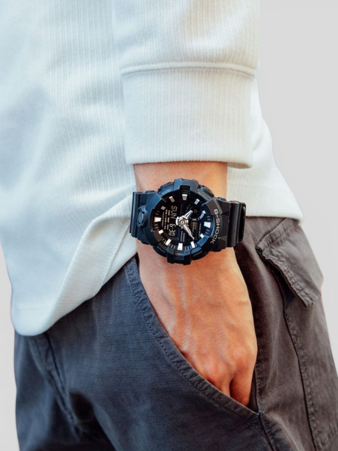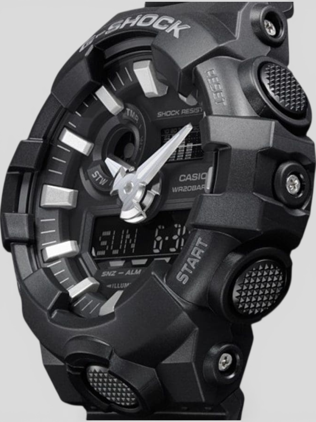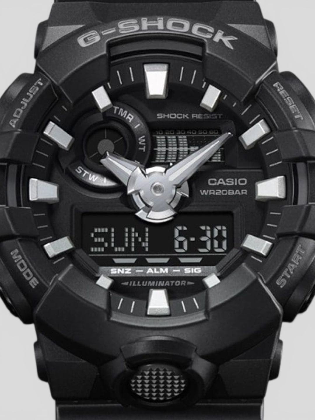 Projetado para quem exige máxima resistência, presença marcante e desempenho confiável, o Casio G-Shock GA-700-1B combina estrutura robusta com um design moderno e agressivo. Seu mostrador analógico-digital em 3D, ponteiros robustos e botão frontal de acesso rápido à iluminação criam um visual esportivo que expressa a essência da linha G-Shock: força, durabilidade e tecnologia.