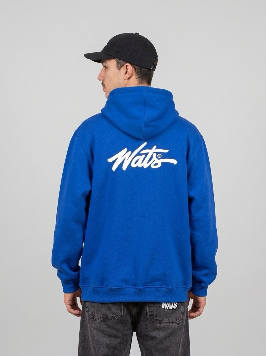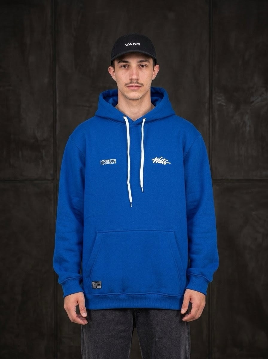 Seu design traz estampa frontal discreta com o logo Wats e a frase “Connected to Streets”, reforçando a essência da marca. O bolso canguru funcional garante praticidade, enquanto o capuz com regulagem por cordão oferece proteção e ajuste ideal. A barra e os punhos canelados proporcionam melhor encaixe ao corpo, e o tecido encorpado garante conforto térmico e durabilidade.